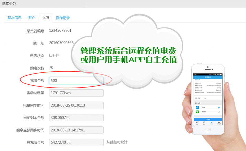 (4) 刷卡充值:適用于射頻卡電能表,電能表無(wú)須接入云服務(wù)器通訊。采用支付寶、微信二維碼收款,自助打印票據(jù)。充值到用戶卡中刷卡完成充值操作,后臺(tái)可查詢記錄。