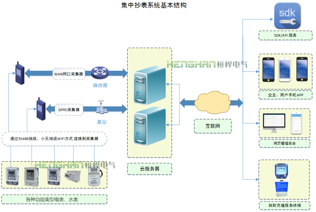 本系統(tǒng)由水電表,云服務(wù)器,數(shù)據(jù)采集器,手機(jī)APP,網(wǎng)頁(yè)后臺(tái),自助充值終端等組成